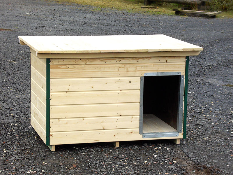 Die „Hundehütte I-klein“ gibt es in 2 Ausführungen: einmal zum Aufstellen in einem Zwinger, d.h. sie sollte nicht direkt der Witterung ausgesetzt werden, und zum anderen die Allwetter-ausführung für den Aussenbereich. Sie hat die Grundmaße 80 x 100 cm und eine Innenhöhe von 70 cm. Sie wird aus unbehandelten Fichte-Brettern und –Platten gefertigt und hat einen Holzboden. Alle Teile sind isoliert. Bei der Allwetterausführung kommt ein Aussenanstrich in Grün und die Bitumenabdichtung des Daches dazu.